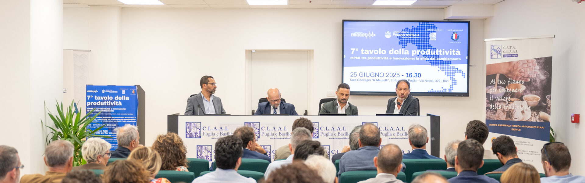 Si è svolto mercoledì 25 giugno presso la Sala Convegni “R.Maurelli” il 7° Tavolo della Produttività , l’iniziativa itinerante promossa dall’ APS Entrobordo e dal Centro Studi ProduttivItalia , in collaborazione con CLAAI Puglia e Basilicata e con il patrocinio del Comune di Bari . Un evento partecipazione e stimolante, che ha messo al centro dell’attenzione temi cruciali per il futuro del tessuto imprenditoriale locale quali produttività, cultura del lavoro e innovazione, ponendo inoltre l’accento sulle importanti ricadute che queste tematiche hanno anche in termini sociali .