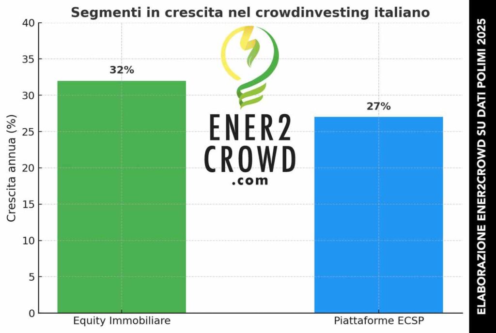 3) Equity immobiliare anch’esso in accelerazione. Con 63,77 milioni di euro raccolti, l’equity crowdfunding immobiliare cresce del 32% anno su anno, dimostrando che gli investitori restano attratti da progetti tangibili e a basso rischio percepito.