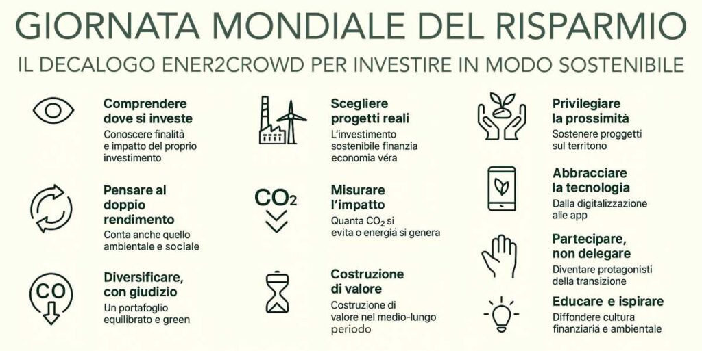 In occasione della Giornata mondiale del risparmio, Ener2Crowd, la piattaforma ed app numero uno in Italia per gli investimenti ESG, lancia il «Decalogo del risparmio sostenibile»: 10 regole per ottimizzare i propri capitali in modo consapevole, etico e ad alto impatto ambientale.